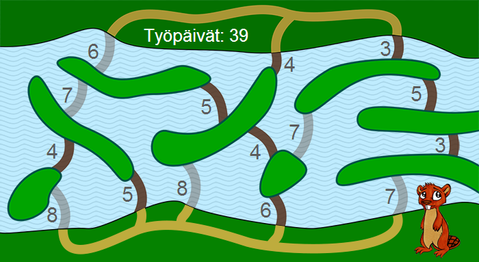 Kuinka monta päivää kuluu vähintään tarvittavien siltojen rakentamiseen? Klikkaamalla rakentamatonta siltaa rakennat sen ja klikkaamalla rakennettua siltaa poistat sen. Saari (tai ylempi ranta) muuttuu vaaleanvihreäksi kun Herra Majava pääsee sille siltoja pitkin. Tehtävän tavoite siis toteutuu, kun kaikki saaret ja ylempi ranta ovat vaaleanvihreitä ja työpäiviä on käytetty mahdollisimman vähän.