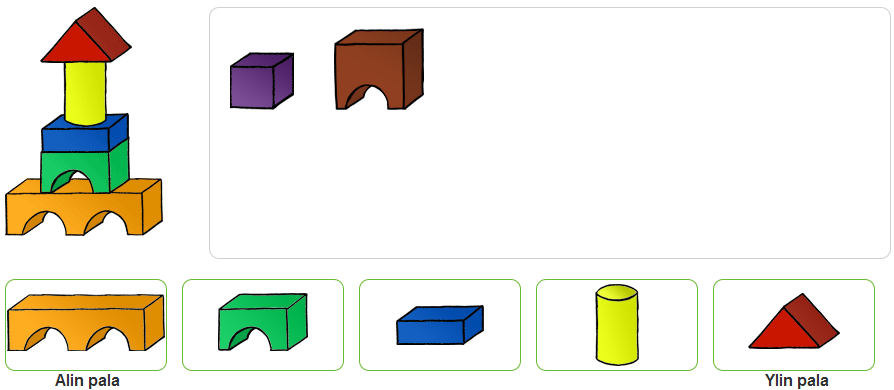 Vedä hiirellä kuvan linnan rakentamiseen tarvittavat palikat linnan alapuolelle oikeille paikoilleen.