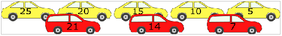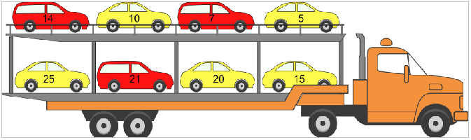 Uusi punainen auto valmistuu autotehtaan tuotantolinjalta joka seitsemäs minuutti. Uusi keltainen auto valmistuu toiselta tuotantolinjalta joka viides minuutti. Valmistuneet autot pysäköidään autonkuljetusrekkaan siinä järjestyksessä kun ne valmistuvat tuotantolinjoilta. Rekan yläosa täytetään ensin. Molemmat tuotantolinjat aloittavat toimintansa samaan aikaan.